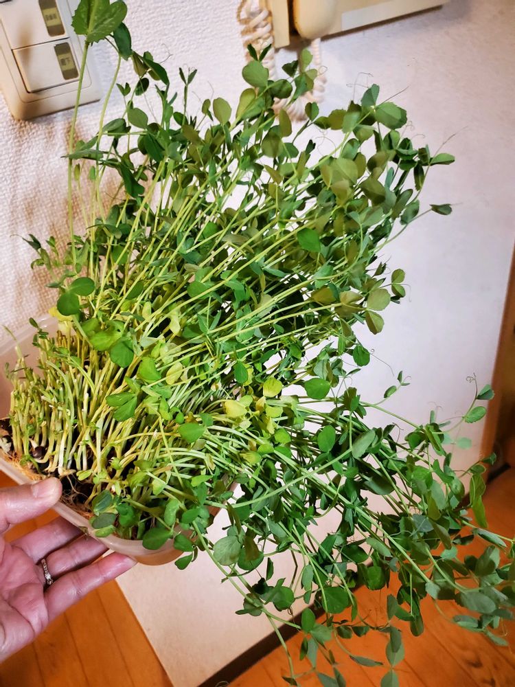 クリスマス前からインフルエンザで4日間寝込んでる間に、2度目の収穫予定の豆苗が、放置空き家の庭みたいになってた😂😂😂