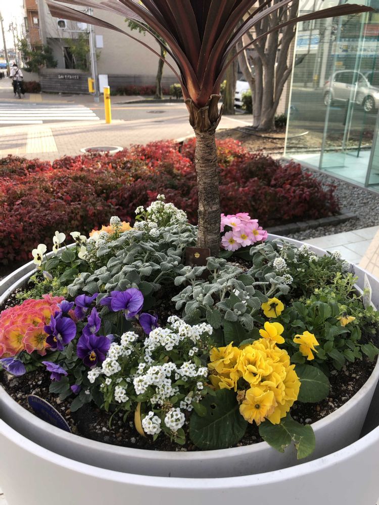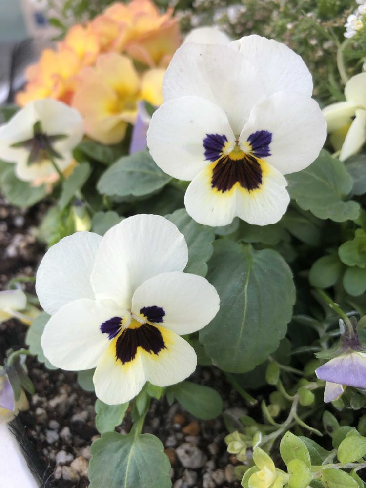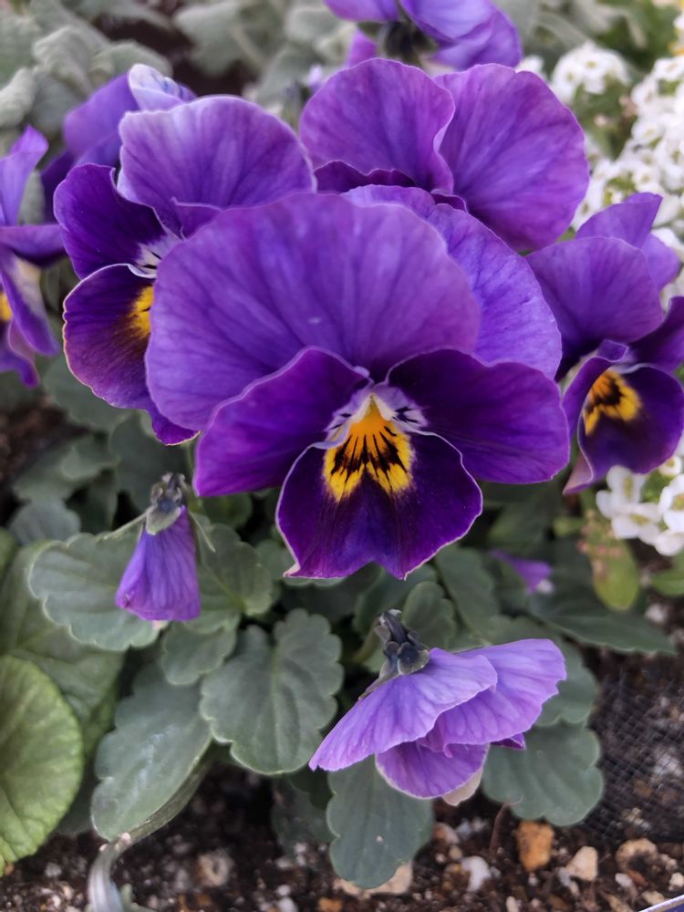 紫色や白色の「ビオラ」、白色の「スイートアリッサム」などの寄せ植えをパチリ!📸💜🤍🌼🌿😄🌞✌️