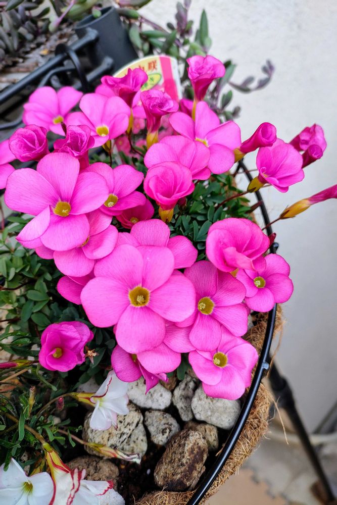 オキザリス桃の輝きをハンギングバスケット仕立てにしました。