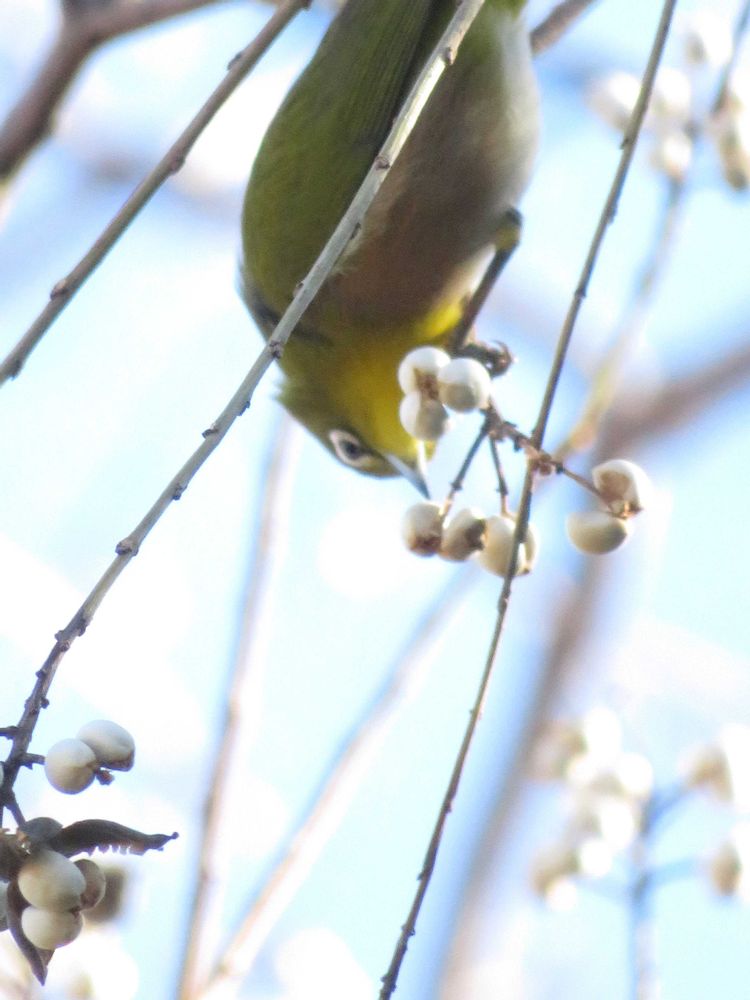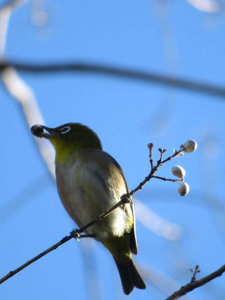 青空にナンキンハゼの実を丸呑みする!メジロ👏👏👏👏