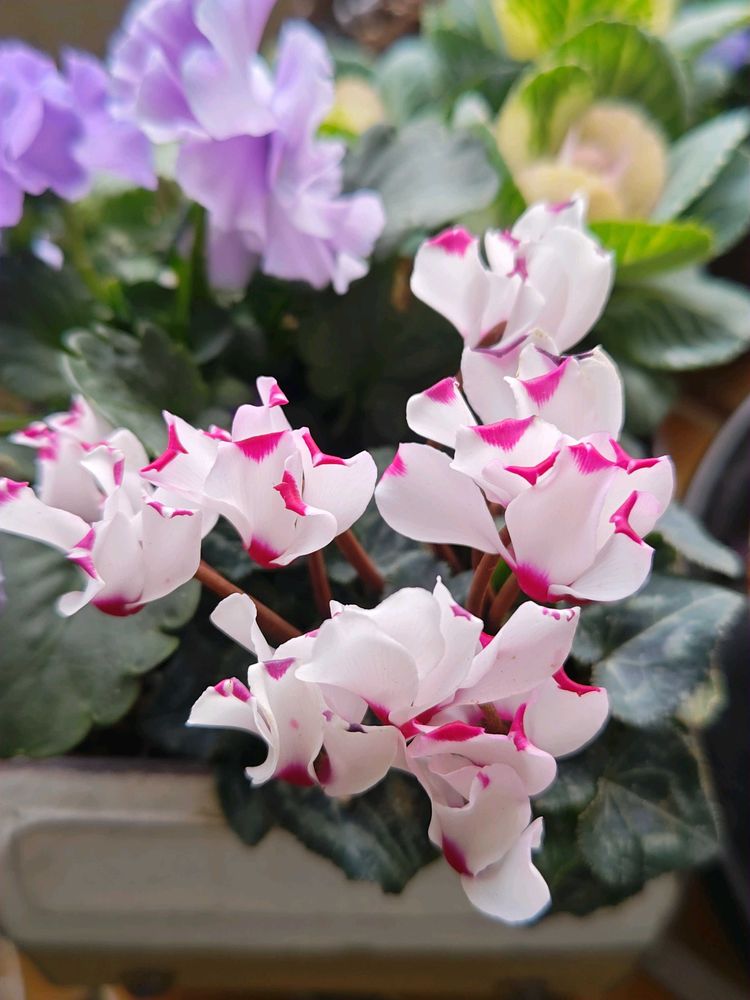 寄せ植えにしてる、ガーデンシクラメン。寄せ植えて約1ヶ月。斑入りのグレコマが大きく育って可愛くなった〜✌