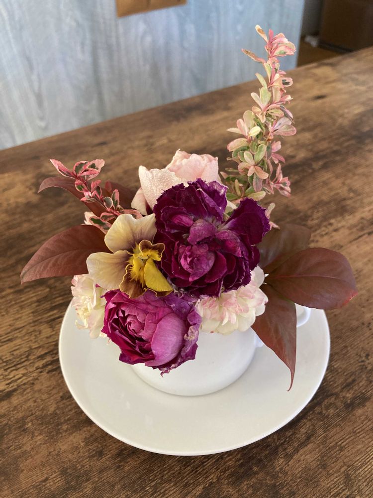 モイストポプリ状態の庭の花、いただいたカップに飾ってみました☕️