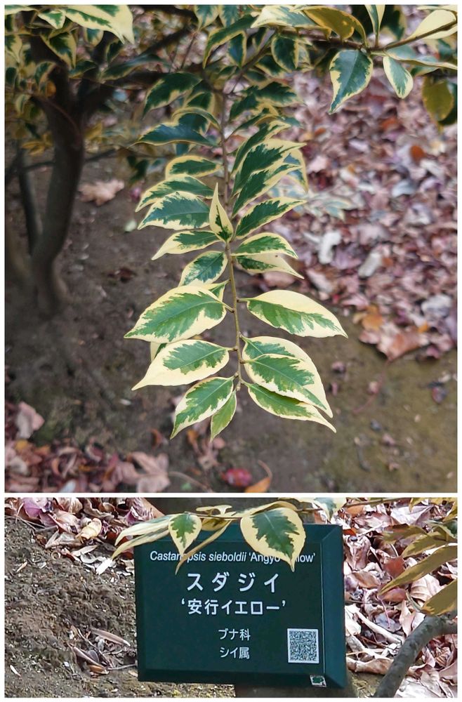 なかなかオシャレな葉っぱですね🧐 「スダジイ」? うちに帰って調べてみると、「スダ椎」🔍️ なるほど💡😀 植物音痴のわたくし☹️ 言葉の音から「スダ爺」を連想してしまった自分が恥ずかしいです🫣🤣(農業試験場内にて)