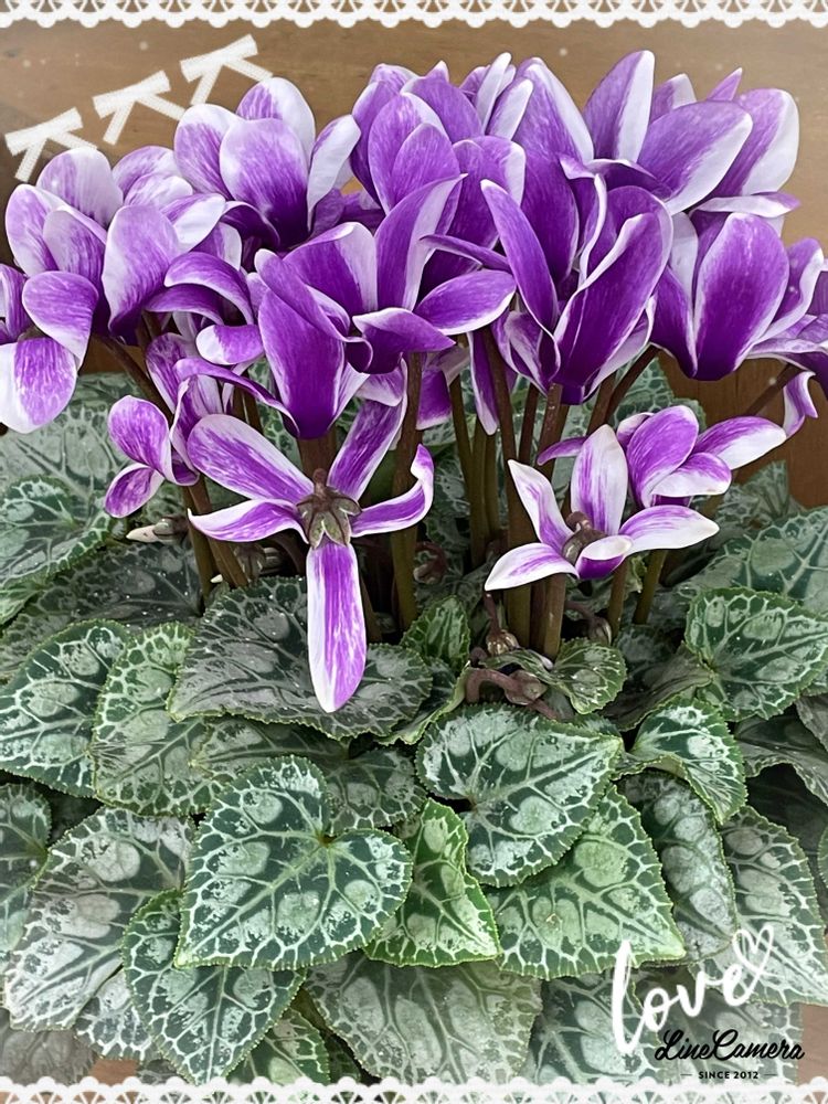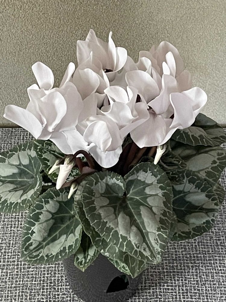 ①のシクラメン、大人色で白と紫色の花色が素敵✨️(*ˊ˘ˋ*)✨️💜🤍🌿.∘