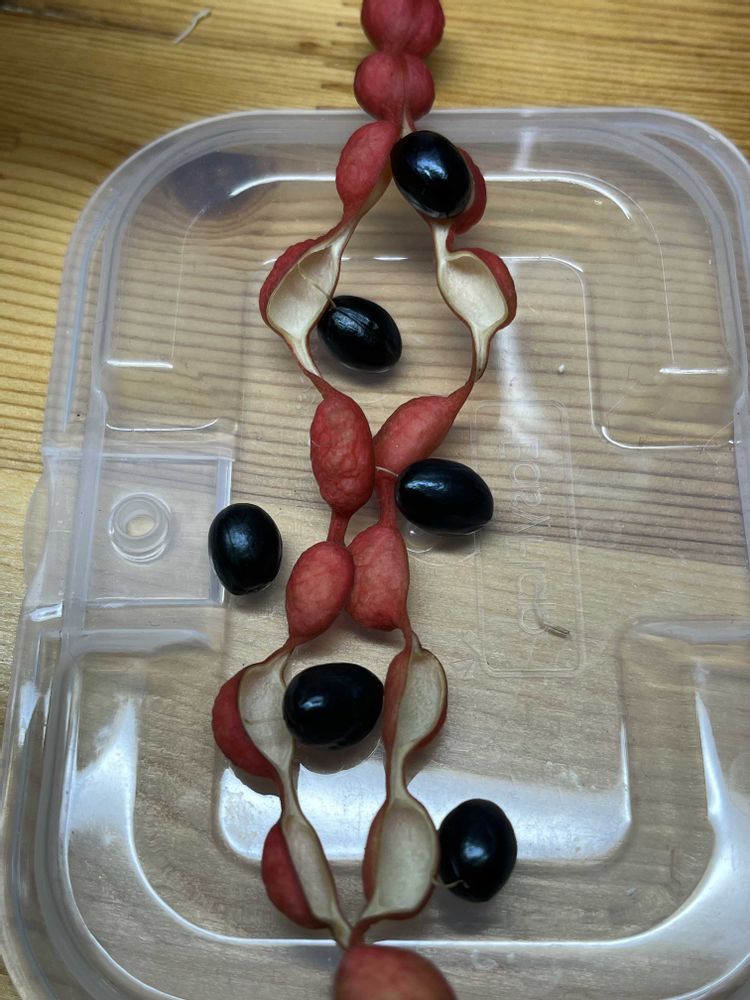 親木から切り離したばかりの種子の状態です。豆科の種子のようにサヤ状の房に格納されていて熟すと出できます。