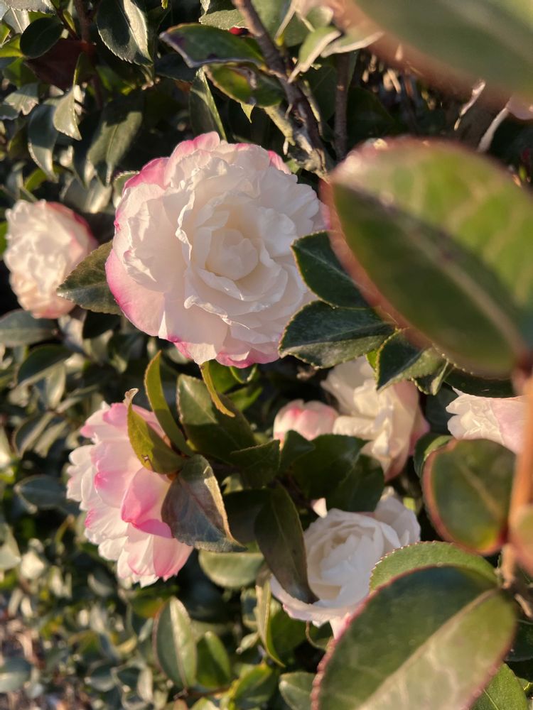サザンカ、つぼみはピンクで開くと中心が真っ白な八重咲き、ウォーキングで毎日見られて嬉しいです😍
