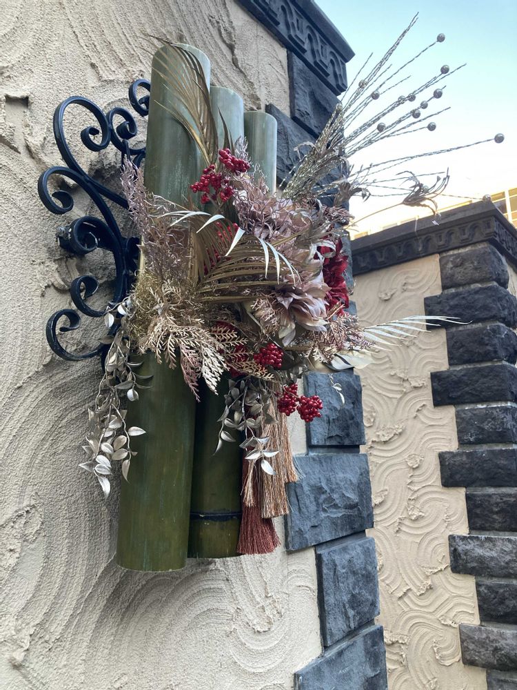 赤坂プリンスクラシックハウスの門柱に飾られた迎春壁掛けフラワーアレンジメント。