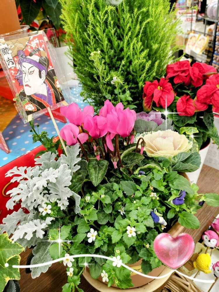 シクラメンやらハボタンやら〜ゴ〜ルドクレストやら~クリスマスにも〜お正月にも〜寄せ植えに〜って事でしょうかネ~⁇⁇