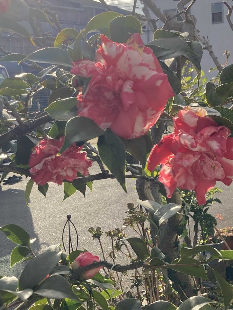 玄関前の大きな椿と南側にも元気のない白い椿がありましたが、この太神楽🩷🤍と一重のピンク🩷の椿を残しました。