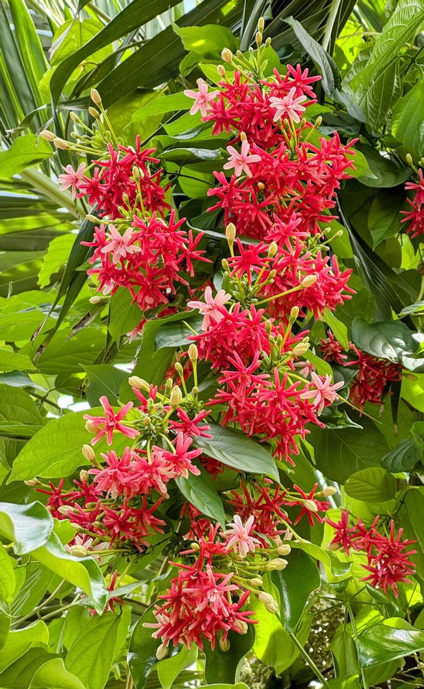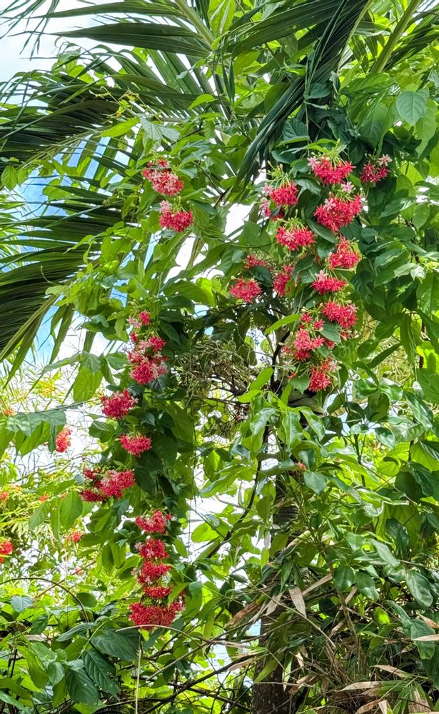 白く咲いてピンクになって赤くなる花。今週は全体的に赤くなってます。赤もかわいい〜! ❤️ 絡みつかれているマニラヤシもかわいく見えます。🌴