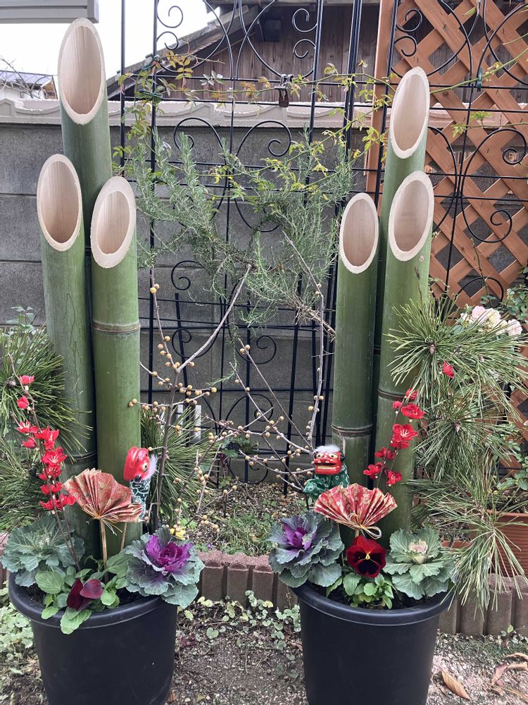 竹、松、ロウバイ、葉牡丹、パンジー、