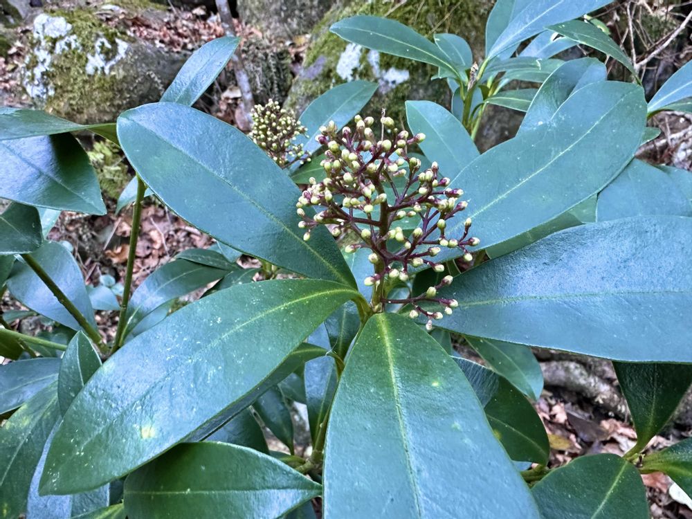 億両のミヤマシキミ、赤い実とつぼみが一緒に見れる季節です。