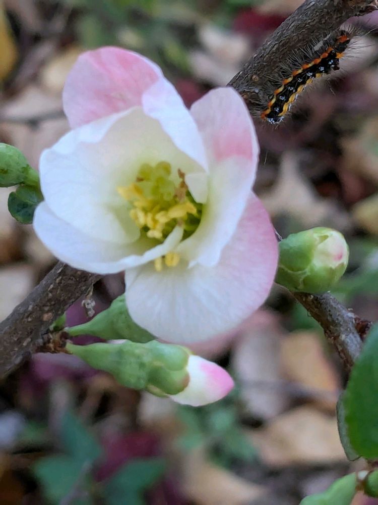 木瓜の花の側に毛虫が😱