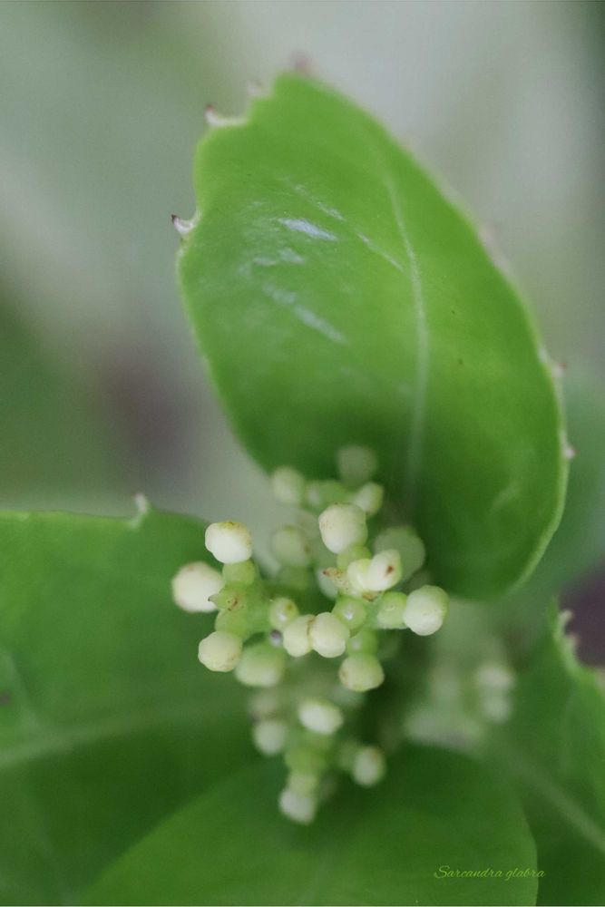 花:花被(花弁と萼片)がなく、楕円形から先が尖った三角形で長さ約 1 mmの苞(小苞)の腋につく