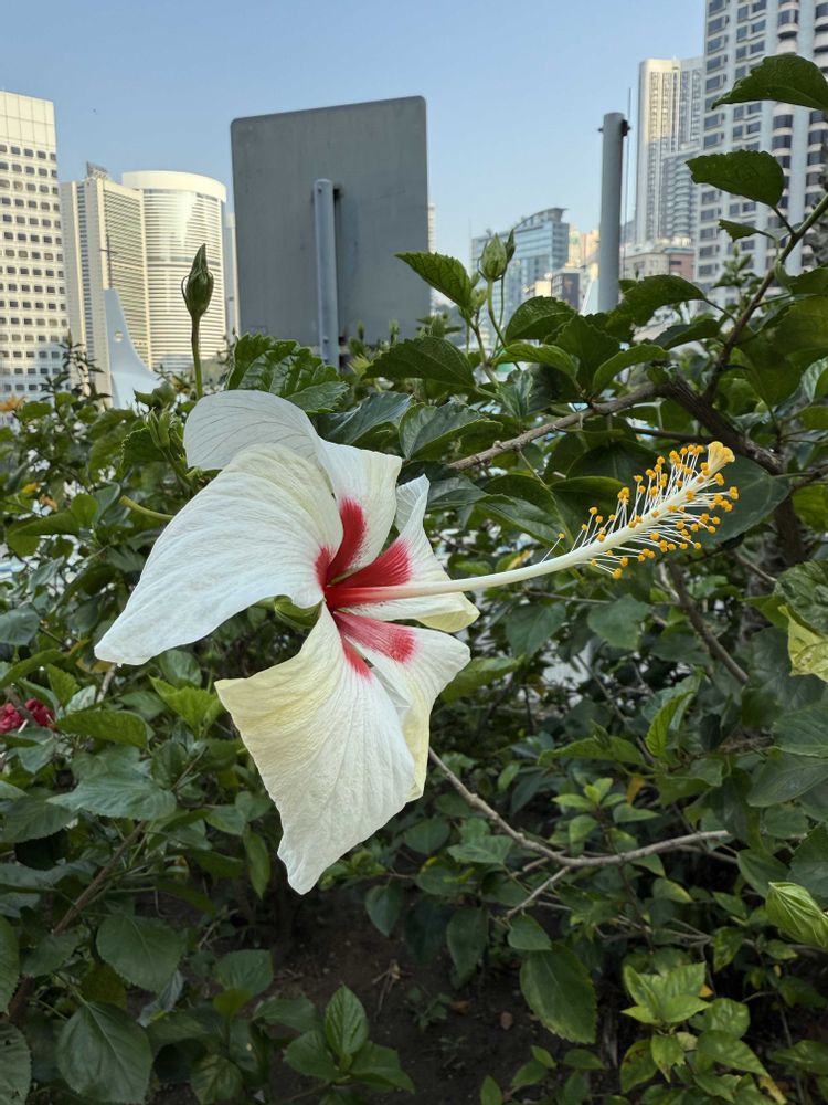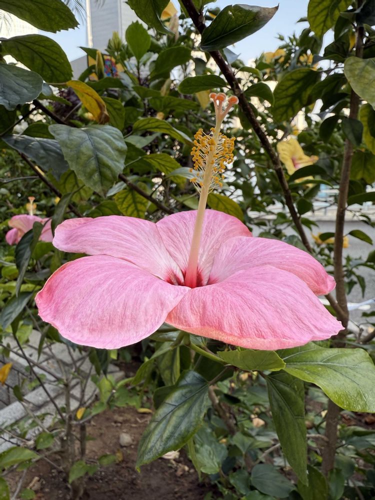 公園の門の外の花壇はいつもハイビスカスでいっぱい😍🧡💛🤍🩷