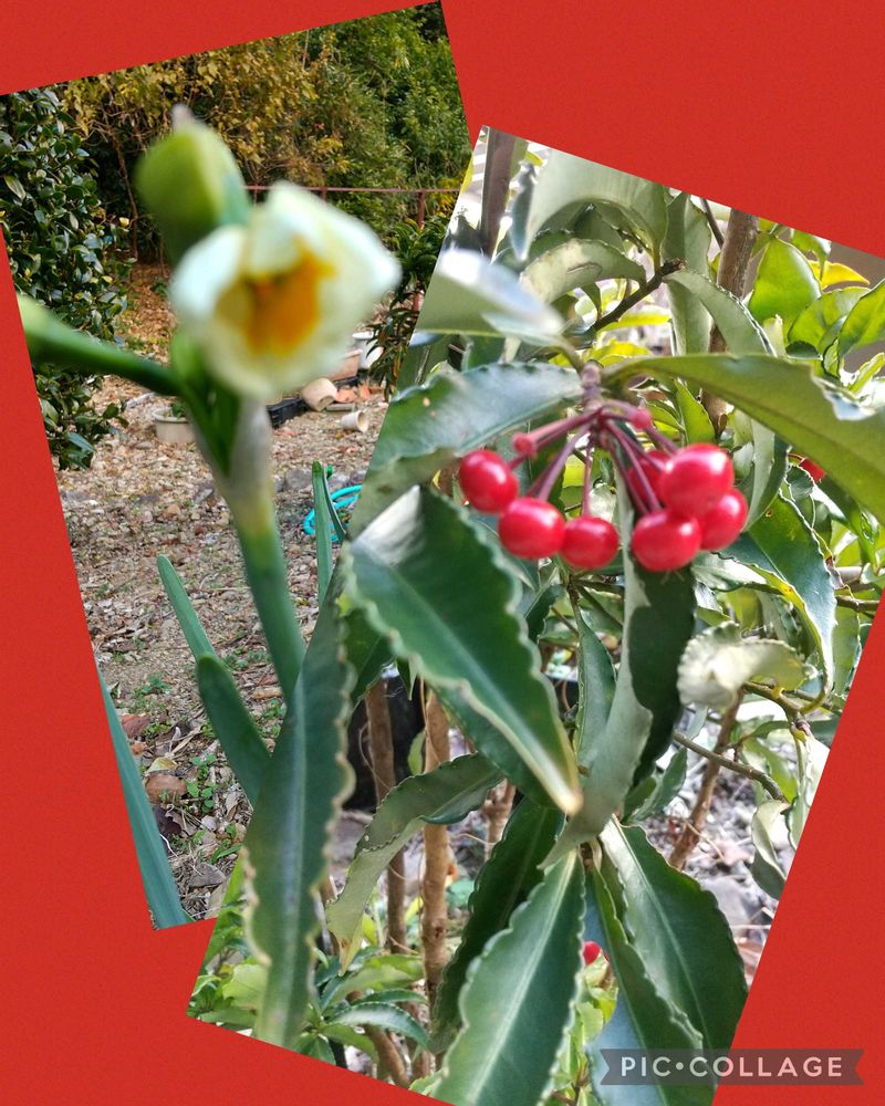 裏庭のスイセンが咲き始めました👍️マンリョウとコラボを✨