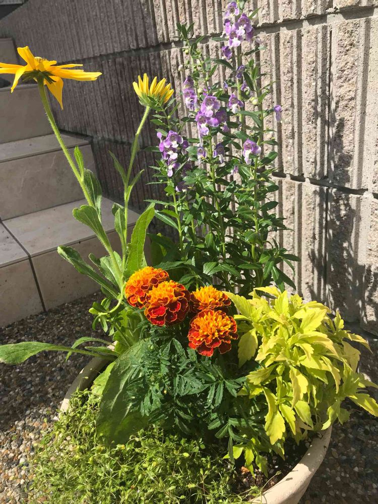 一目惚れのアンゲロニアを引き立てた色合いにしたつもりですが、初めてなのもありよく分からない寄せ植えになりました💧