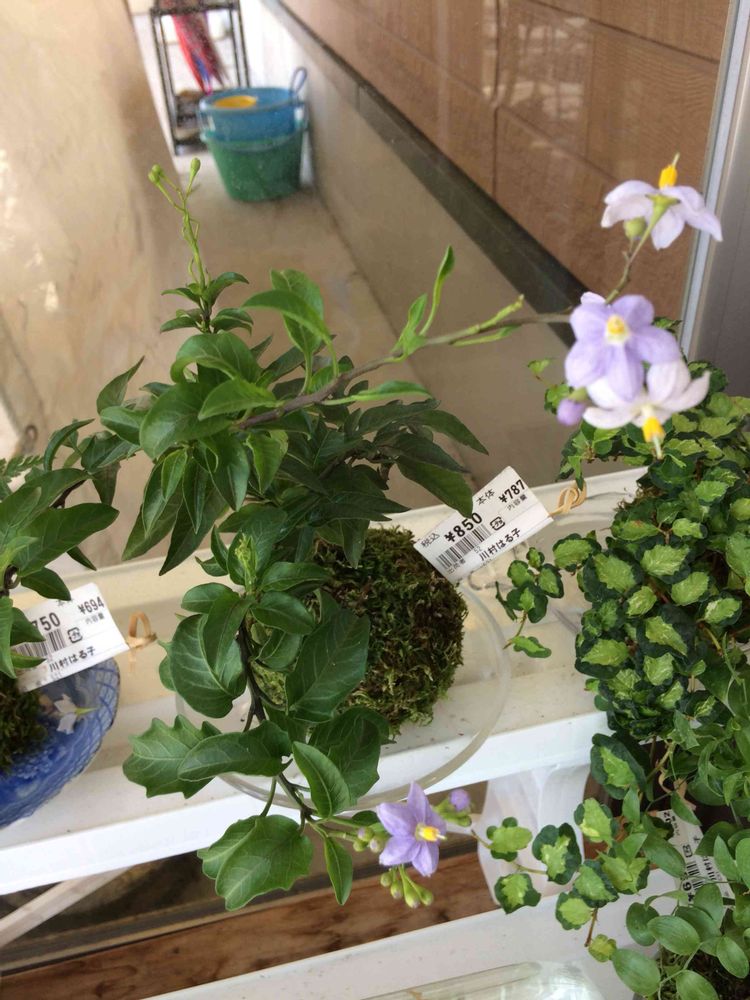 コケ玉で可愛いお花を発見❗️ナスの花に似てるけど名前は何でしょうか❓