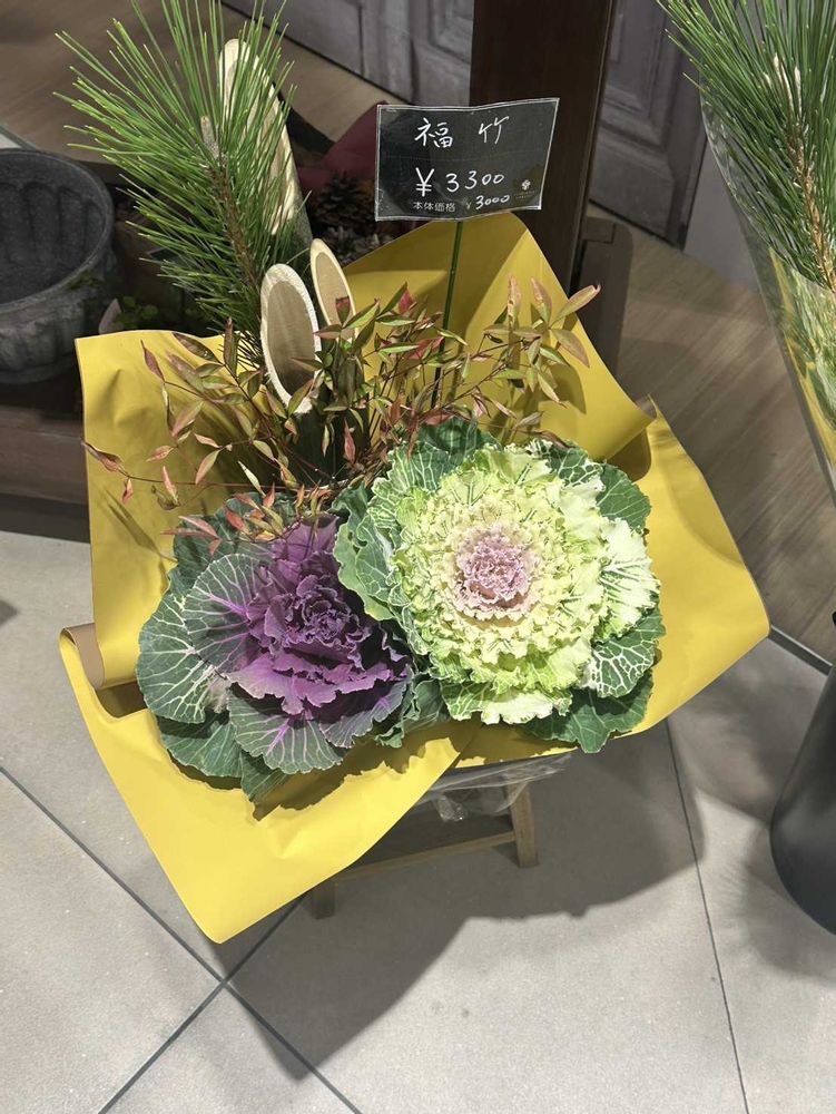 いつも覗くお花屋さんのお正月フラワーアレンジメントです🩷葉牡丹、千両、万両、南天.菊,松が家にあるので自分で作りますが参考になるのでパチリさせていただきました🙏