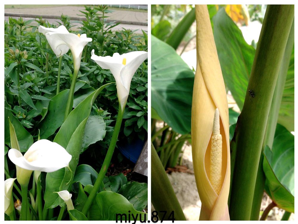左は サトイモ科のカラー 庭に植えっぱなしでたくさん咲いてくれてますよぉ〜🌼