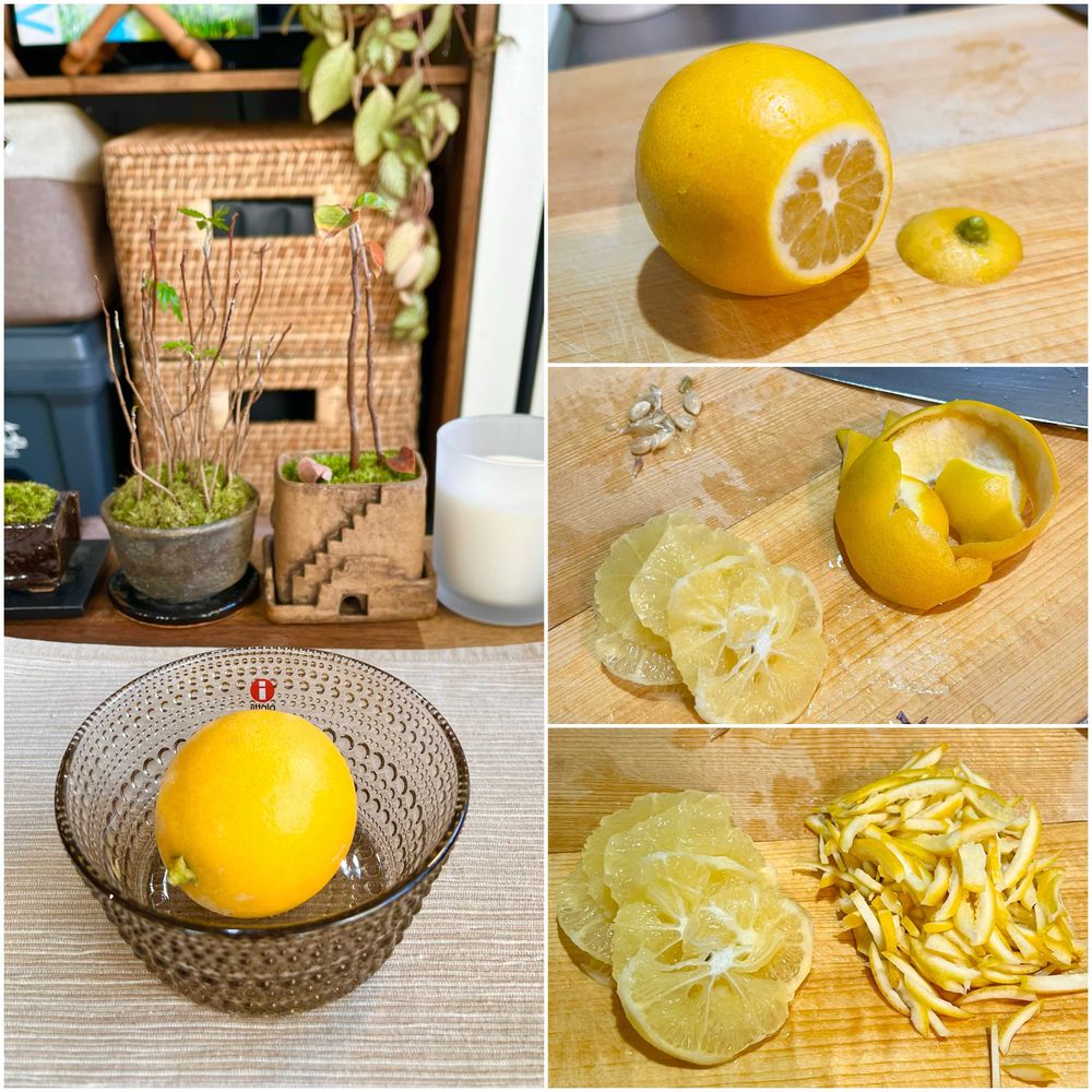 レモンの花の香りが好きで、お迎えしてから2年。1年目は花はたくさん咲いたのにほとんどがポロポロ落ちて😢 今年は筆を使って人工授粉しました。何とか1個だけ残って大切に育ててきました。ただ、ちょっと目を離した隙に大きなアオムシ🐛が3匹も! 葉っぱは全滅。大丈夫かなと心配していましたが、何とか収穫までこぎ着けました🤩