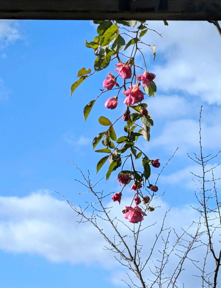 昨日は雪混じりの風に激しく揺られ今日は晴空に何ともなかったように咲いてるツルバラです🍃🩷