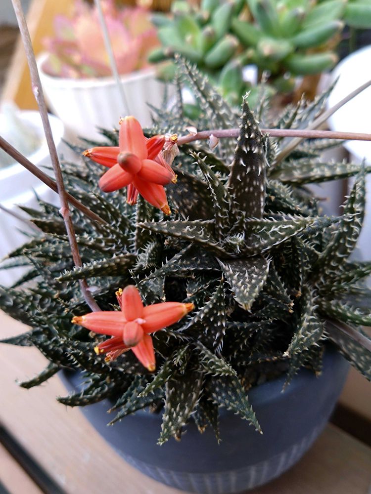 スゴーイ😆長ーく伸びる花茎の先端に立体の星型のお花、しかも鮮やかなオレンジ色🍊ステキです💓