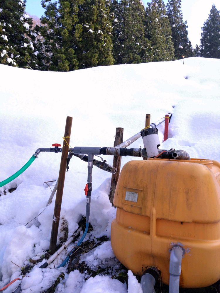 ②塩ビ管で作った沢水を分岐する装置を取り付けました。