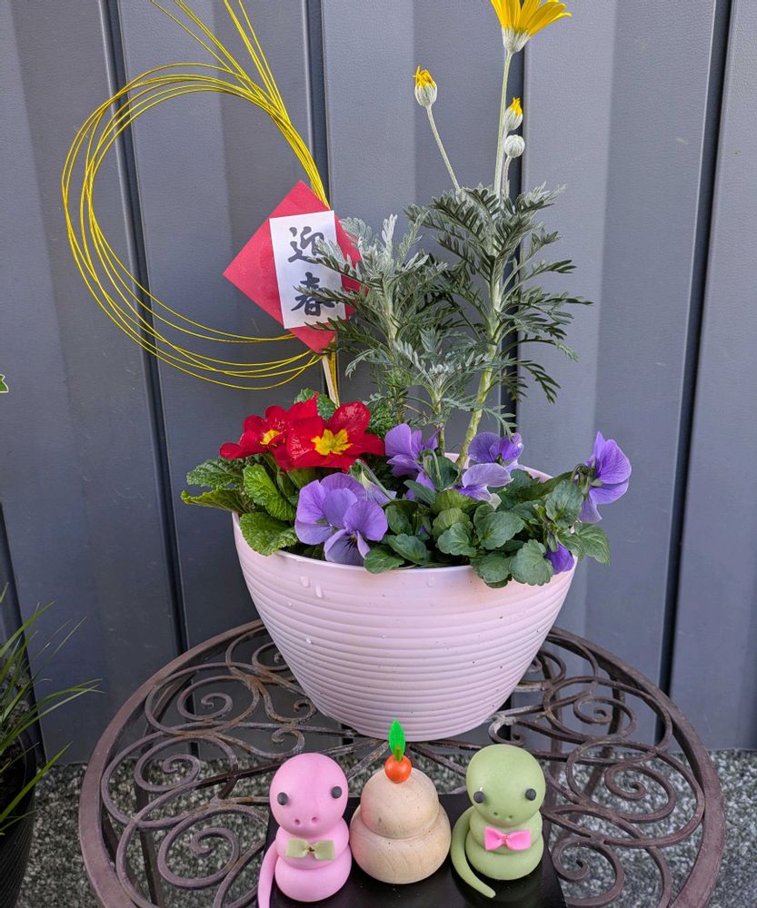 お正月の寄せ植え、黄色と紫と赤、さらりととても素敵です、🐍は、お友達作なんだ!お上手👏