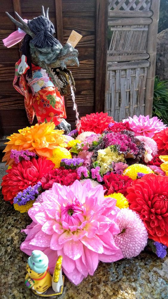 龍が振袖着た可愛い花手水❤️🩷💛💜