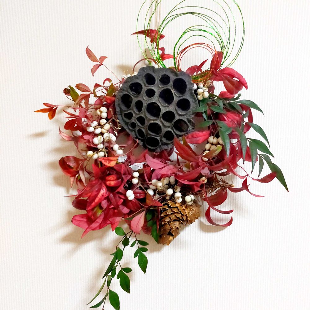 蓮の額、お多福南天、ハゼの実、緑の南天の葉