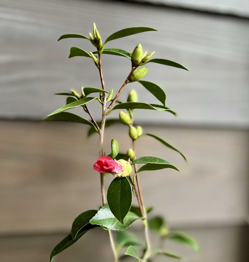 ③椿は送料無料にするために、タイサンボクケイパレスの小さな苗と同梱したモノ。小さな侘助、椿らしい赤色。