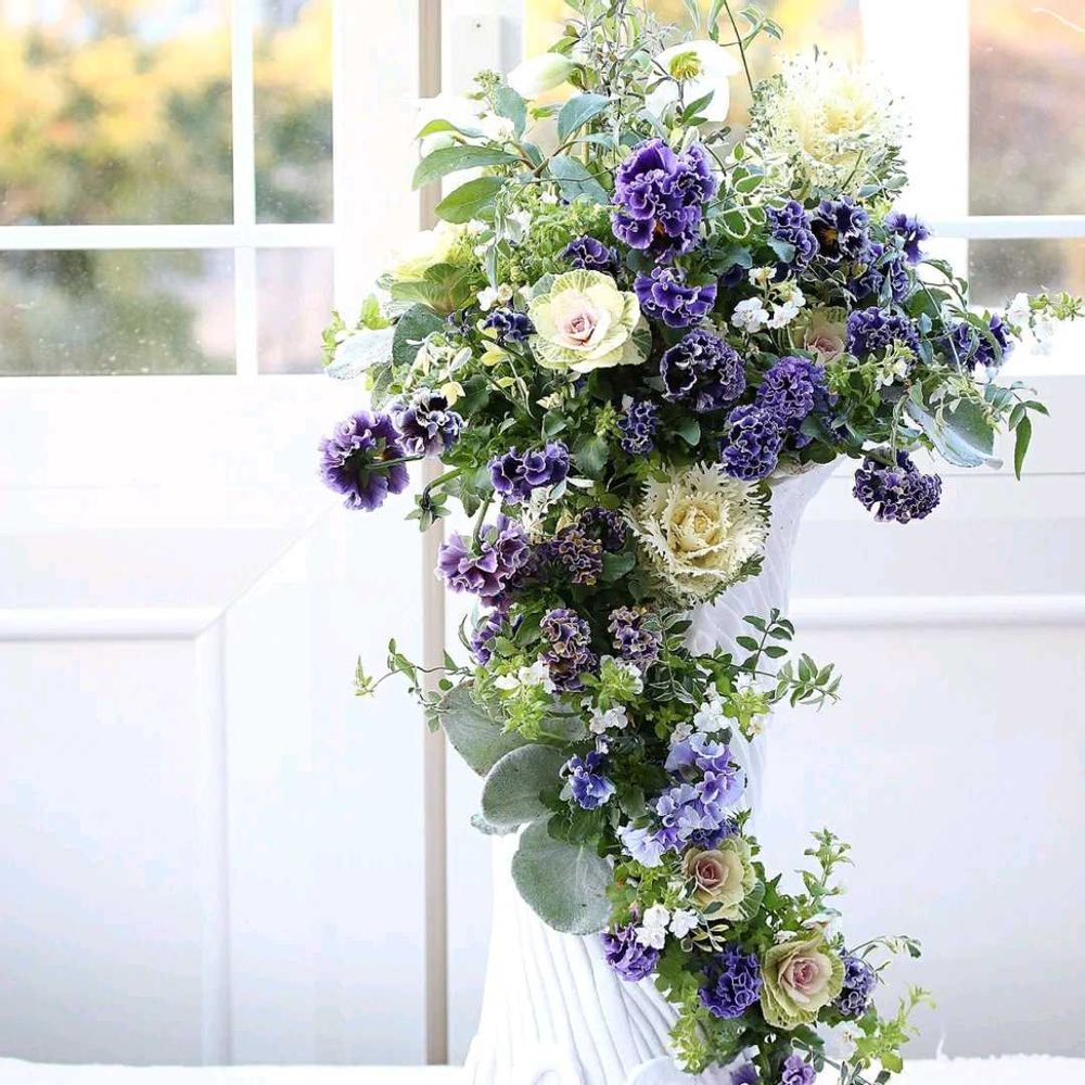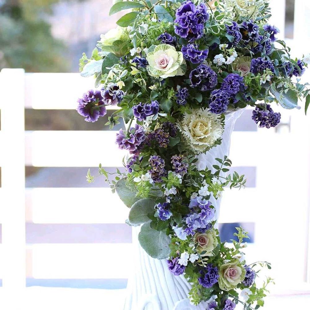 トップにクリスマスローズ、松原園芸さんフリル咲きパンジーアンティークラッフルと葉牡丹で流れるようなラインを意識しました。ウレタンシート巻きに初チャレンジ!進化するあおき式は楽しいです♪