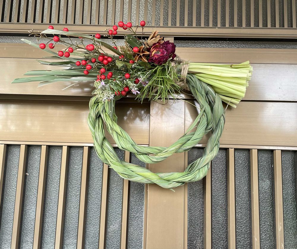 しめ縄は庭のレモングラスをネジネジヨジヨジして飾りはドライにしていた薔薇と南天がローズマリー