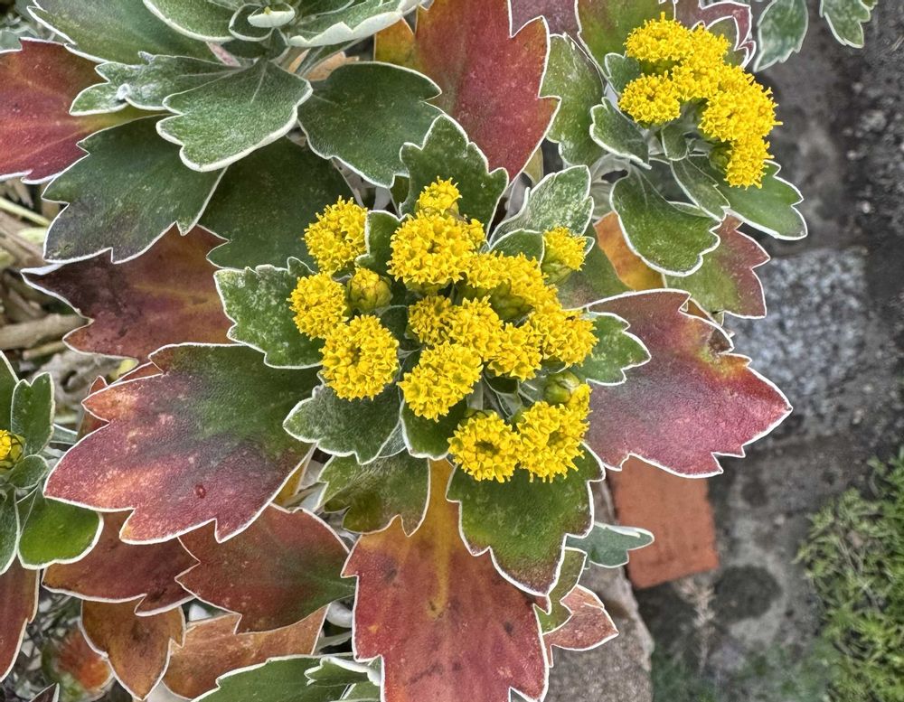 伊豆など暖かい地方の海岸近くに自生している野草ですが、晩秋に小さな黄色い花を房状に咲かせる姿が美しいので庭にもよく用いられています。葉はやや肉厚で切れこみが入ります。縁に白い筋があるように見えますが、葉裏の白色が回りこんでいるようにも見えます。株は自然にまとまり成長もやや遅めなので扱いやすいです。ただ地下茎で横にほふくし最終的には大きい株になるので、小さな庭では摘心や株分けを行う必要があります。強い日差しや乾燥を好み、病害虫もほとんど発生しないので放任でもよく育ちます