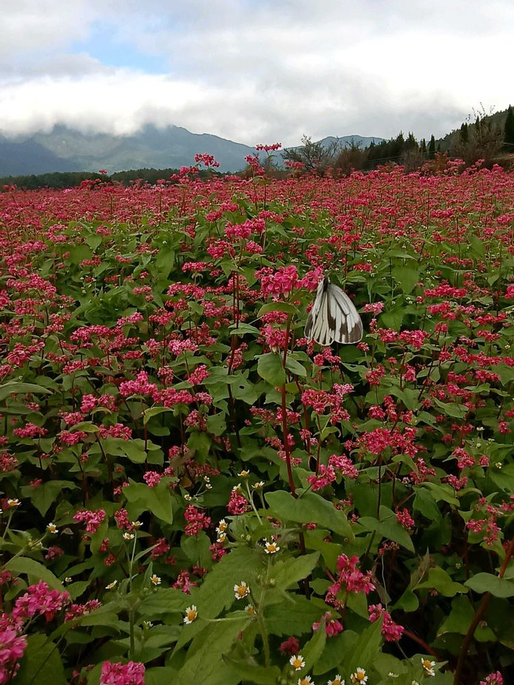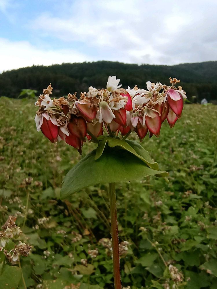「高嶺ルビー」という品種のお蕎麦です。信州大学の氏原暉男名誉教授が1987年にヒマラヤの標高3800mのところから赤い花の咲くそばを日本に持ち帰り、タカノ株式会社(宮田村)と共同で品種改良を行って作られた品種なのだとか。一般のそばよりも背丈が低く、痩せた土地でも栽培できるのですが、収量は3分の1程度と、反収(田畑1反=約10アール当たりの作物の収穫高)は激減してしまうため、主に景観作物・観賞用として利用されているそうです。