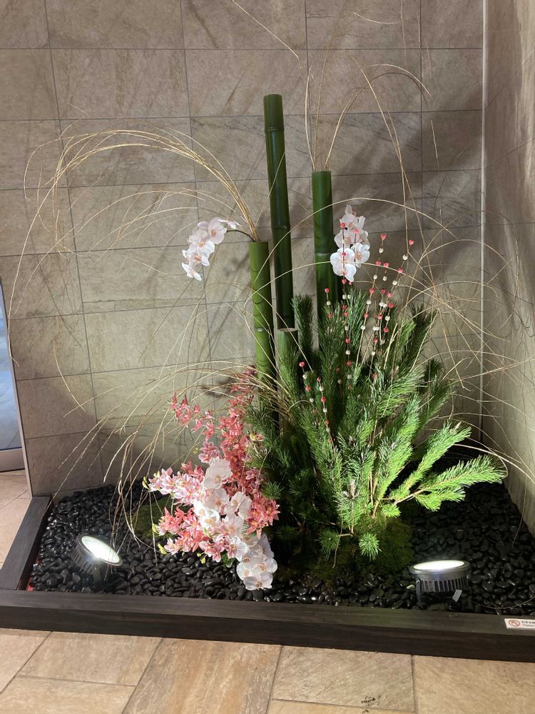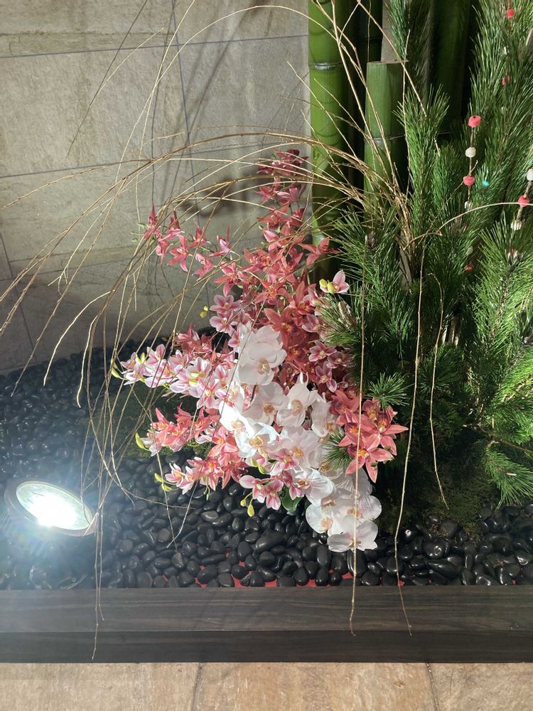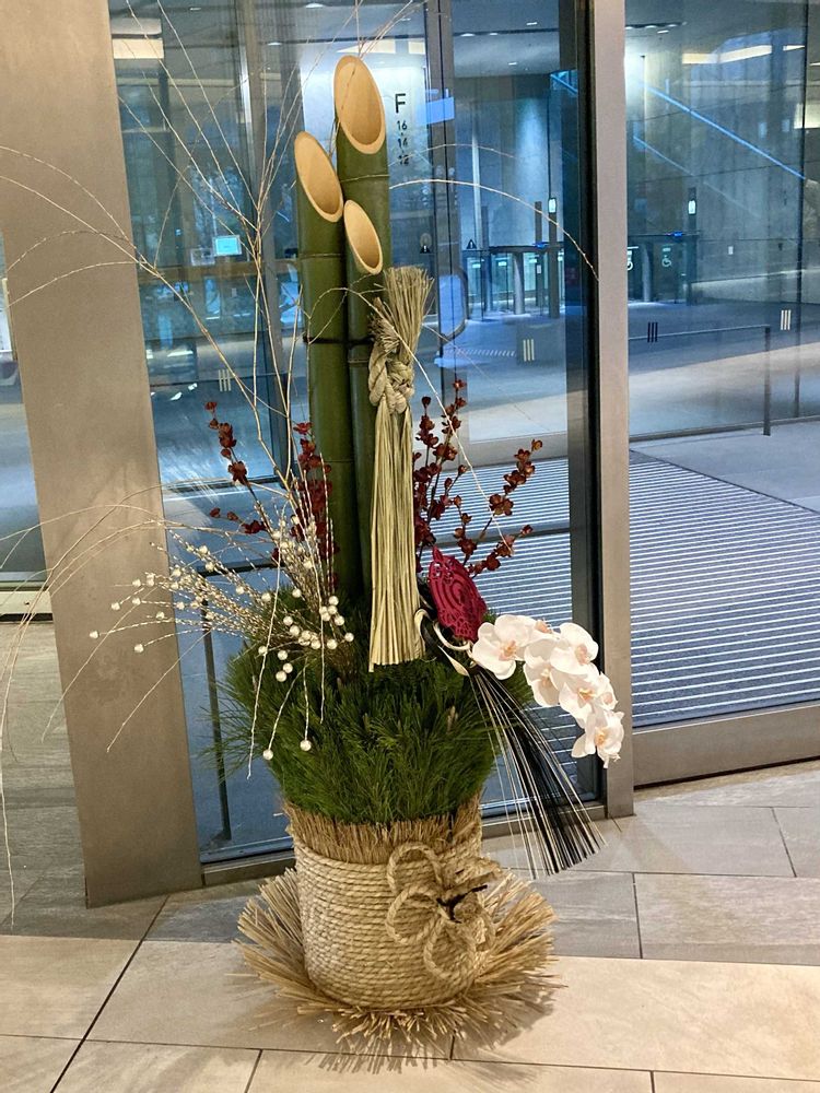 東京ガーデンテラス紀尾井町1階駐車場入口の装花と2階テナントの門松。