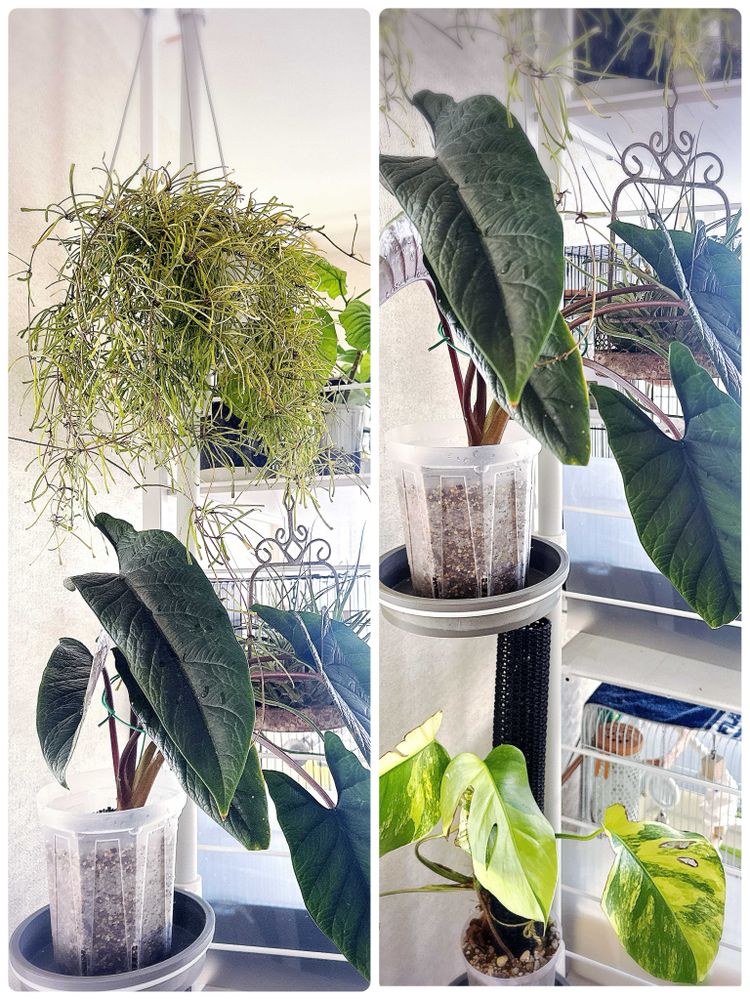 アロカシアといつも葉焼けで破れかぶれのモンちゃんのオーレアとレツーサやエアプランツを下げました🪴