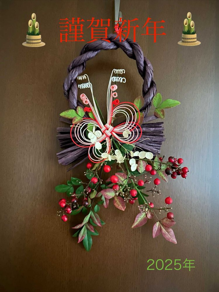 100均のしめ縄と水引に庭の南天をプラスして作りました
