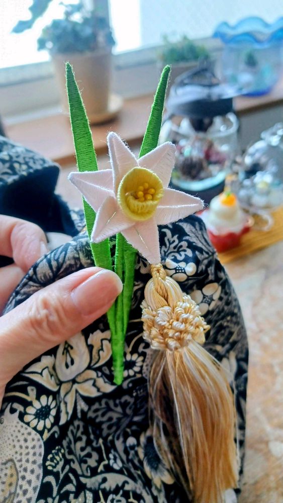 年末にちょっとした鞄を作った時に、ブローチ付けようと水仙を作っていた途中だったから仕上げてみたり、着物を解いて春先に羽織るコートを作ろうと、型を作ったり。