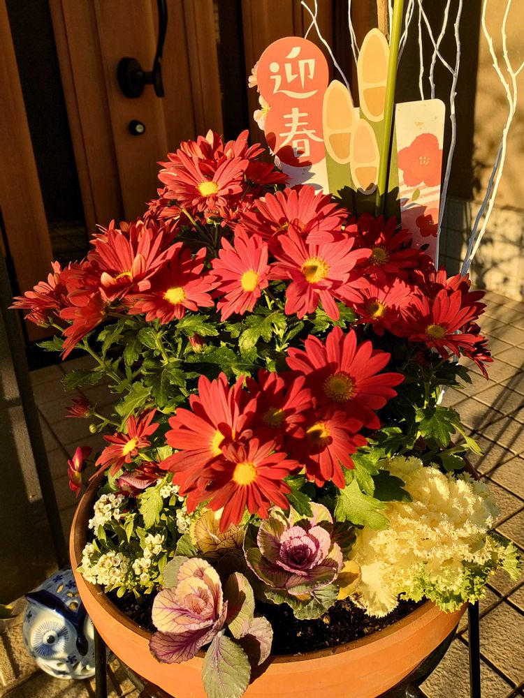 ①寄せ植えに初めて菊❁を使いました。この色にして良かったと思っています。葉牡丹も少し育ったような🕵️🤍