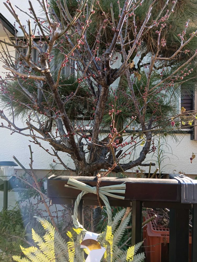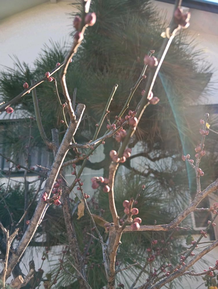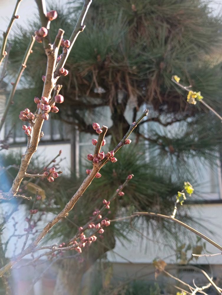 紅梅の蕾、朝日をあびて♥️箱根駅伝の応援、今から3区、5区で、実家の前を走り抜けます今年はTVで👏