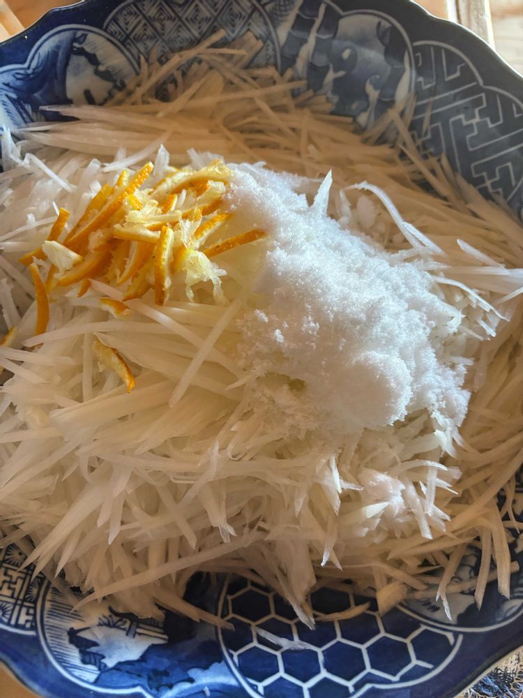 大根、柚子皮、塩、砂糖、酢、仕上げには、荒微塵の落花生です。