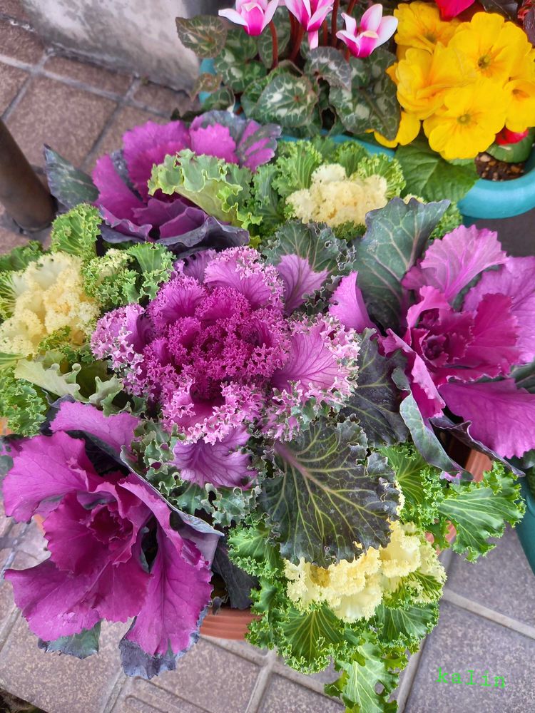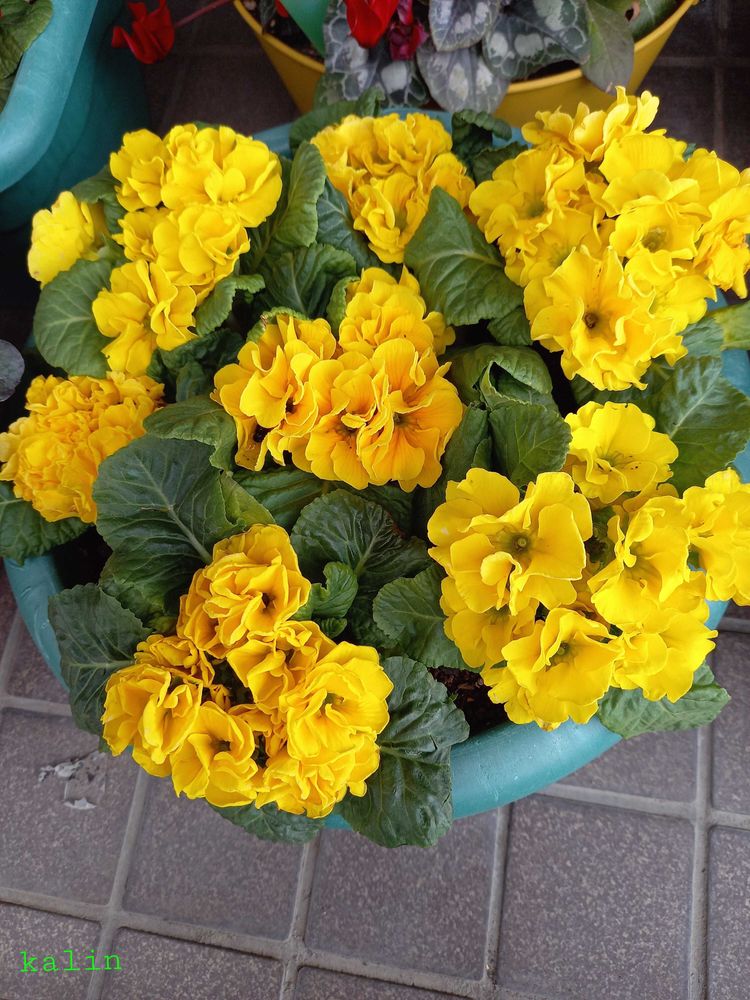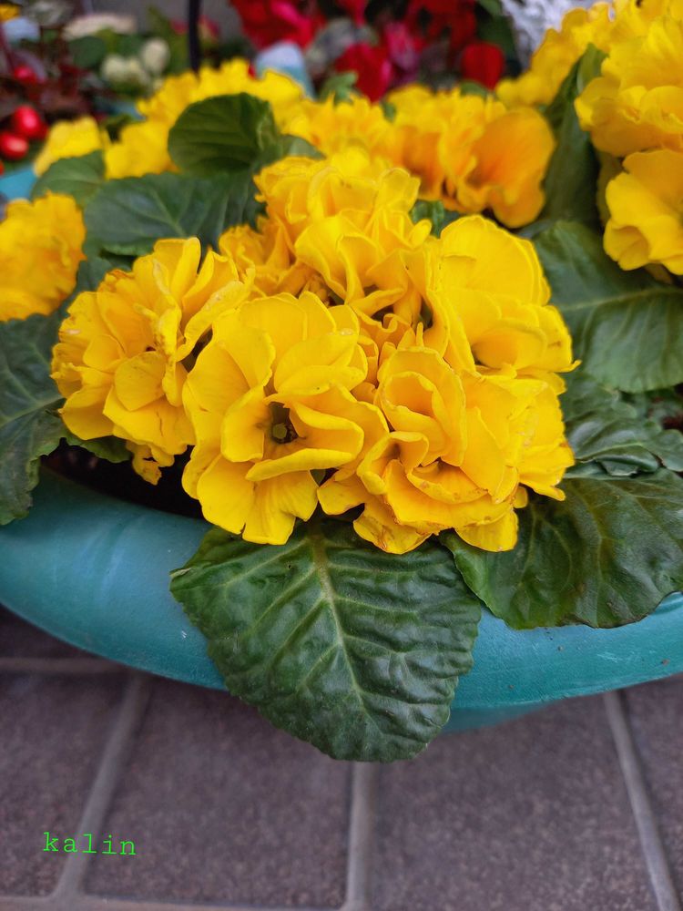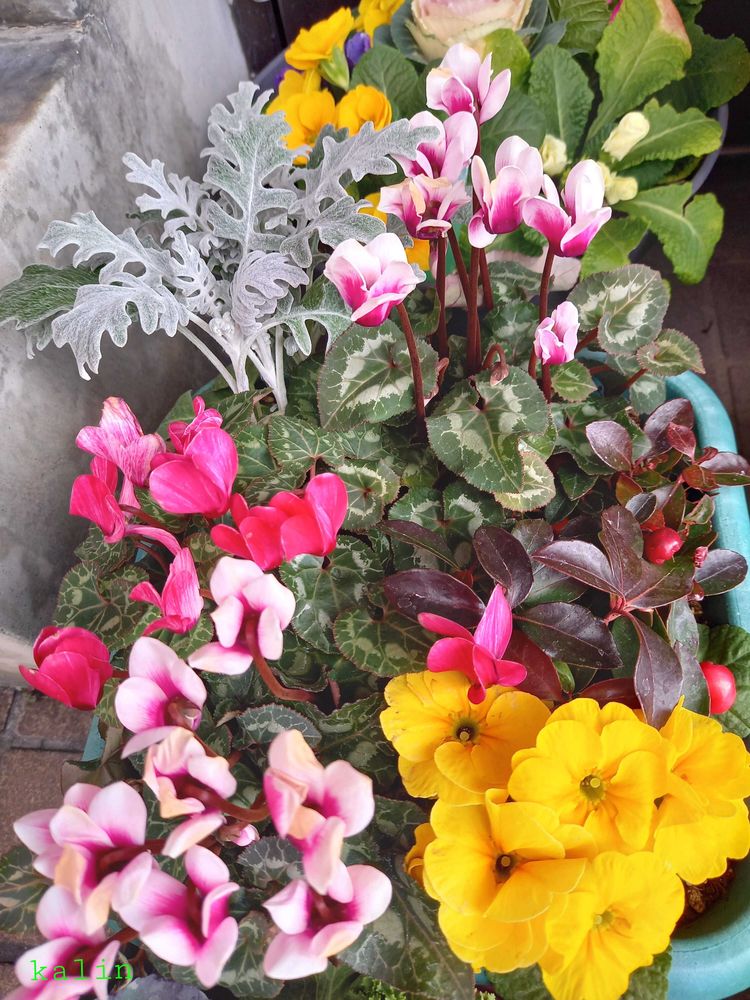 黄色のプリムラ・ジュリアンがたくさん寄せ植えで華やかですね☺