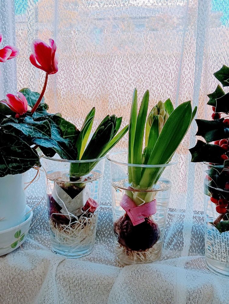 ヒヤシンス🩷と💜を品川駅構内から🎀家から持ってきたお気に入りのクリスマスホーリー🔴