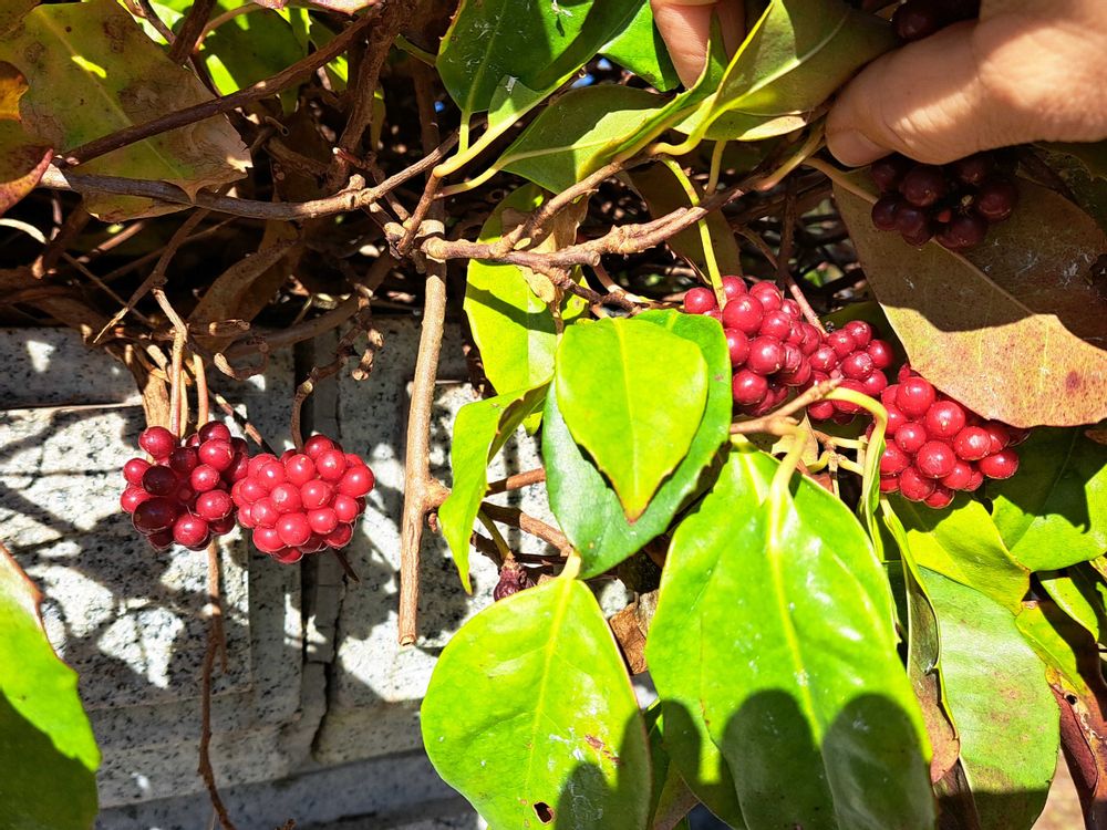 今年は、生い茂った葉に覆われて、赤い実が隠れていました。