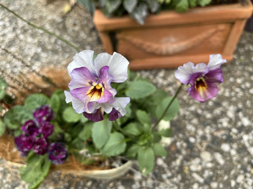 ①今日のお花がプリムラということで、寄せ植えに使っているジュリアン・ラブ♪白が少し入っていて、それがキラキラしているように見えるんですよね✨