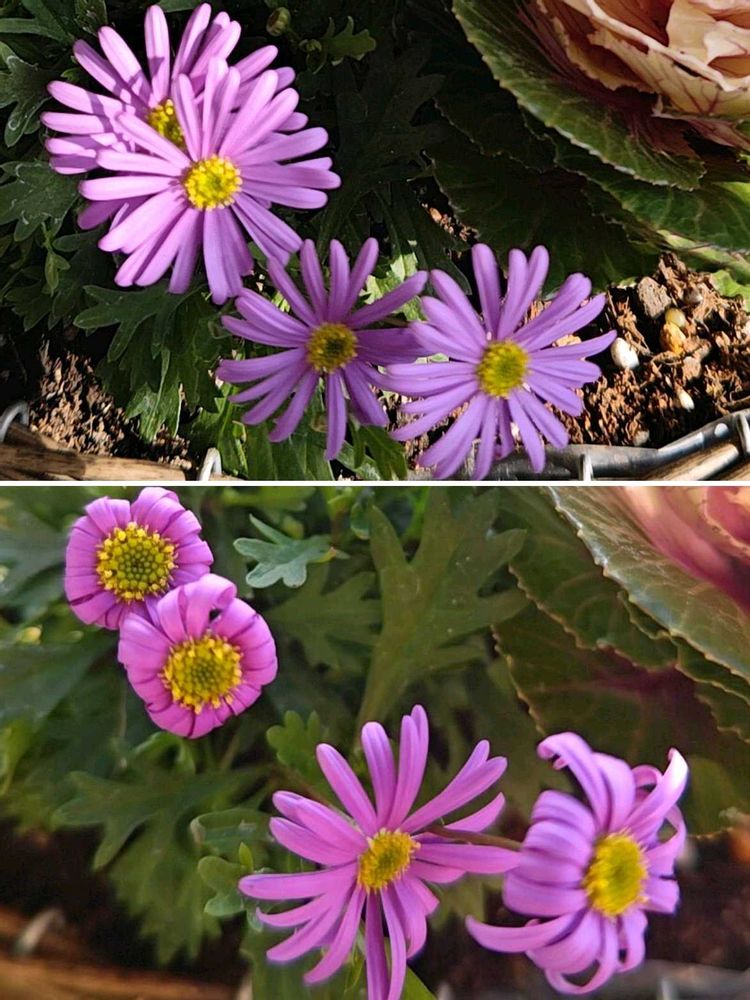 寄せ植えのブラキカム•ブラスコ、次々花が咲いて可愛い💕ブルーデージーやフェリシアと同じく、夜の花弁を外巻きに巻き込んだ姿も可愛くて😍