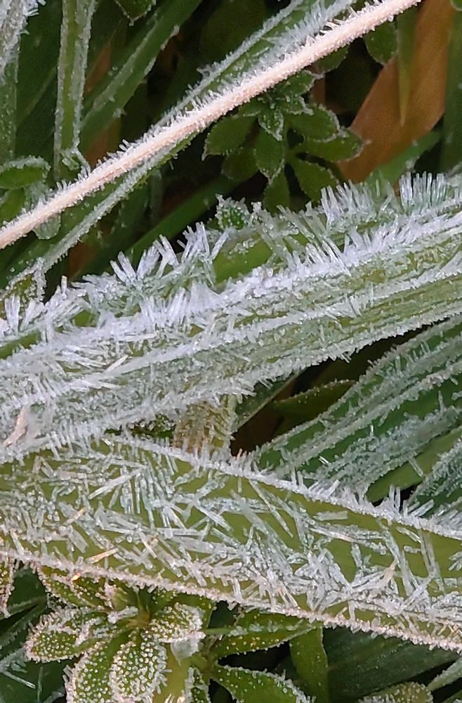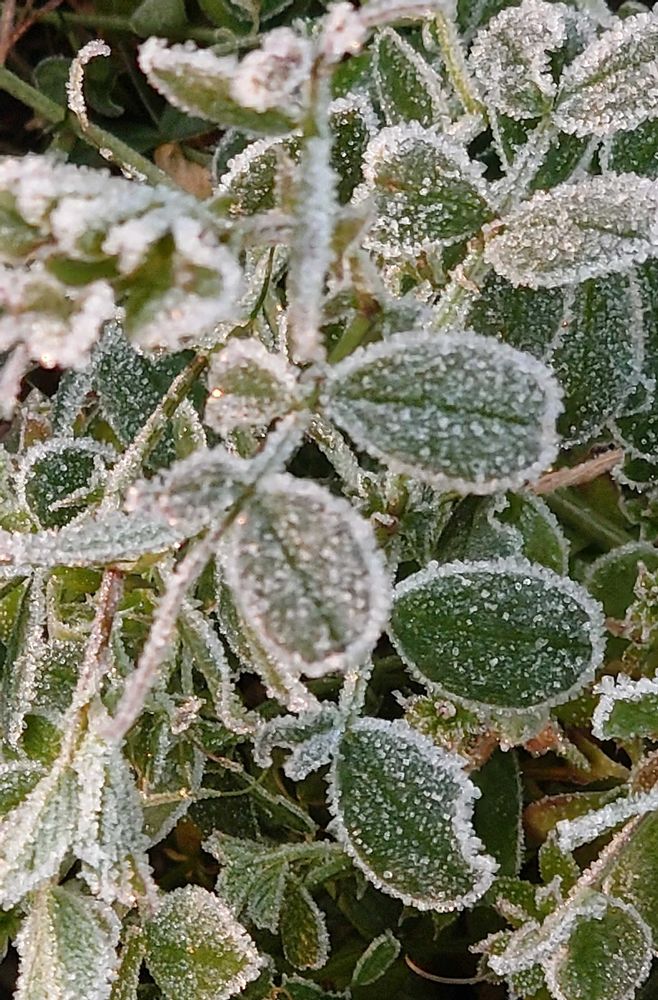 霜が降りるくらい随分冷え込んだんですね。人間も夏場の暑さや冬の寒さに負けず毅然と立ち尽くして生きていかなくてはなりませんね。
