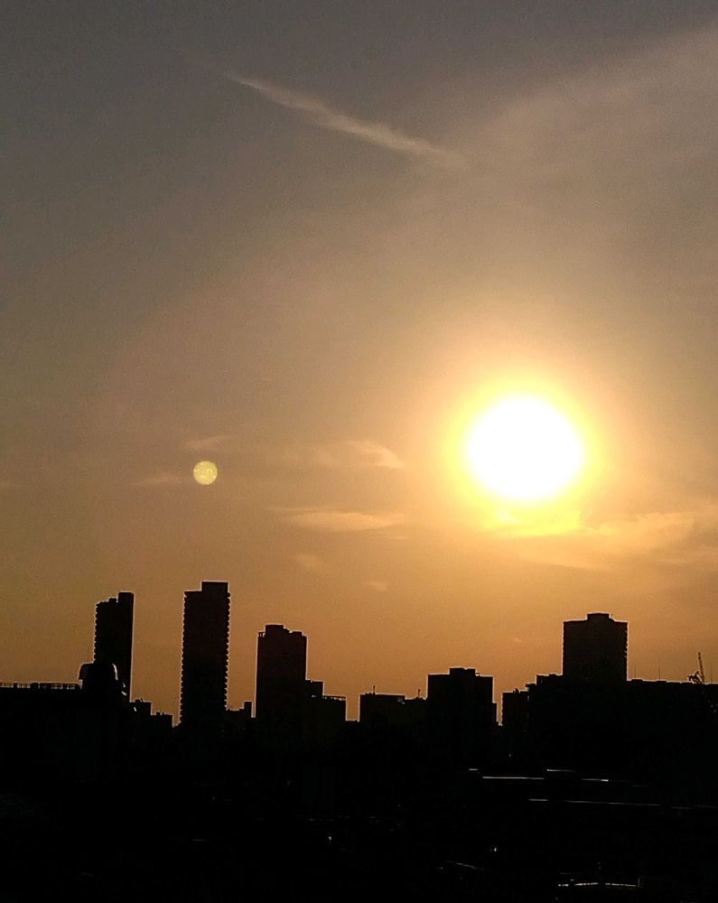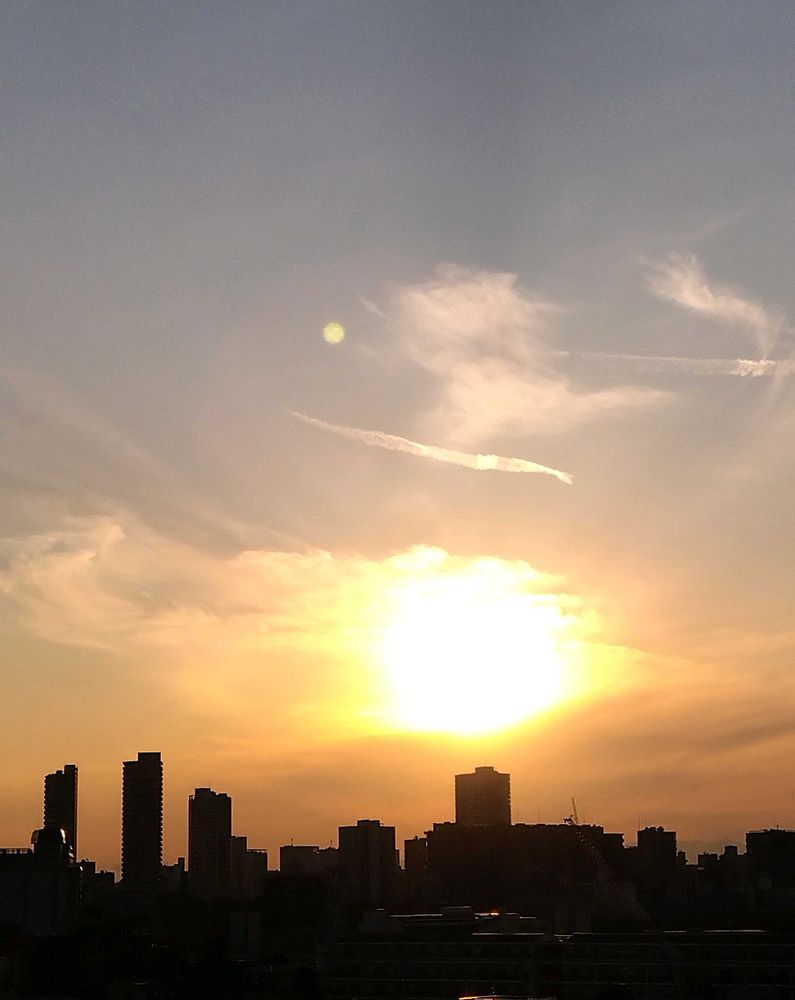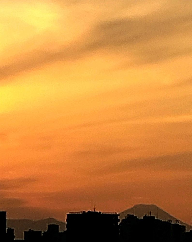 ビルの谷間にう少しで沈む夕陽と夕焼けの空にそびえ立つ富士